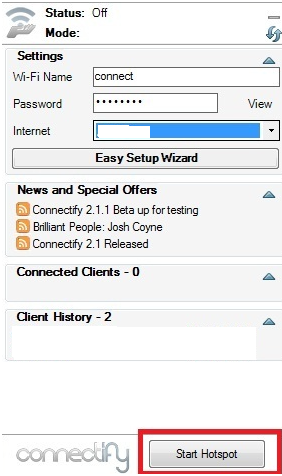 Вы видите основное окно программы. До этого были настройки, нажимаем на кнопку «Start Hotspot»