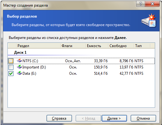 Далее мы переходим к выбору размера будущего раздела. Максимальный размер – это свободное пространство диска «Е», который мы выбрали донором.