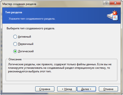 Важно. Если создаваемый раздел нужен только для хранения файлов, то выбираем тип «Логический». Если для установки системы, то «Активный». Переключая типы разделов, можно подробно изучить их назначение.
