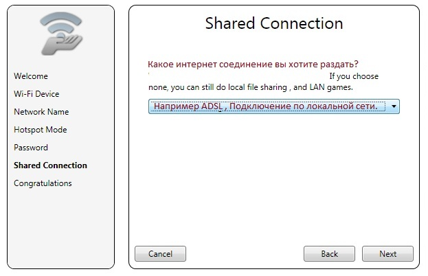 Нужно указать, какое именно интернет соединение вы хотите раздавать при помощи Wi-Fi (ADSL, 3G modem и пр.). Для этого используйте выпадающий список соединений. Завершив выбор, нажмите «Next»