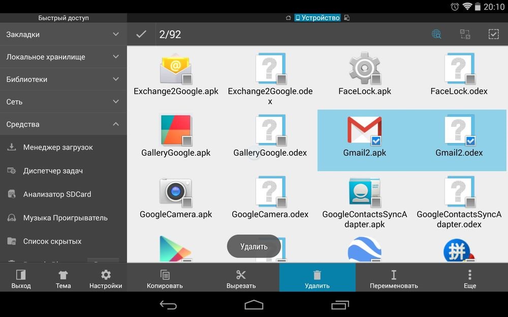 Через сам ES Проводник тоже можно удалять защищенные приложения из специального графического интерфейса, а не путем доступа напрямую в файловой системе. Для этого нужно пройти по пути в меню проводника - "Библиотеки" – "APPs" – "Пользовательские" – "Системные", там выбрать нужные в раскрытом списке, и деинсталлировать их полностью одним простым нажатием.