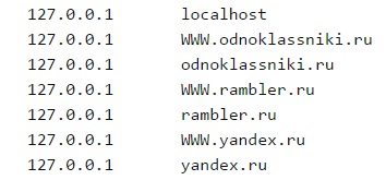 Следующий шаг — открываем hosts с помощью обычного блокнота, находим строчку «127.0.0.1 localhost». Именно в таком же виде вам нужно будет прописать список тех сайтов, на который будет запрещен доступ, заменяя слово localhost на нужный вам ресурс, написанный без знаков слеша «/» и начального «http». Ниже представлен наглядный пример того, как у вас должен выглядеть список:
