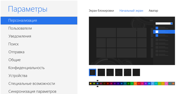 Для того, чтобы изменить оформление темы интерфейса, то есть выбрать сочетание цветов и узора фона, следует пройти в раздел «Параметры компьютера» -> «Персонализация» -> «Начальный экран». Самый быстрый способ вызвать приложение настроек является нажатие сочетание клавиш «Win» + «I», а затем выбрать внизу панели «Параметры» пункт «Изменить параметры компьютера».