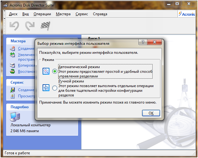 Если вы в первый раз видите интерфейс Acronis и не знаете, как работать с программой, то выберите «Автоматический режим». В нем самые основные функции будут доступны.