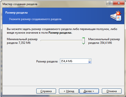 Далее мы переходим к выбору размера будущего раздела. Максимальный размер – это свободное пространство диска «Е», который мы выбрали донором.