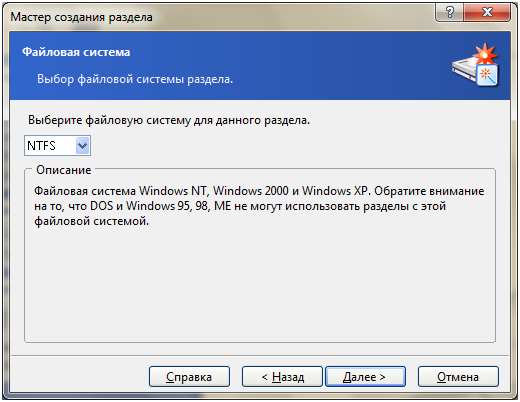 Нажимаем «Далее» и переходим к следующему окну, в котором выбираем файловую систему