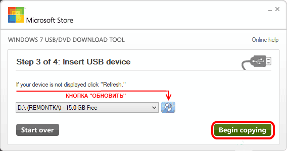 5. Нажмите «Begin copying» (Продолжить копирование). Программа предупредит вас о потере данных, хранящихся на USB-девайсе;