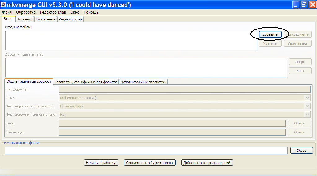 3. В правой части окна, в поле "Входные файлы" нажимаем кнопку "Добавить"